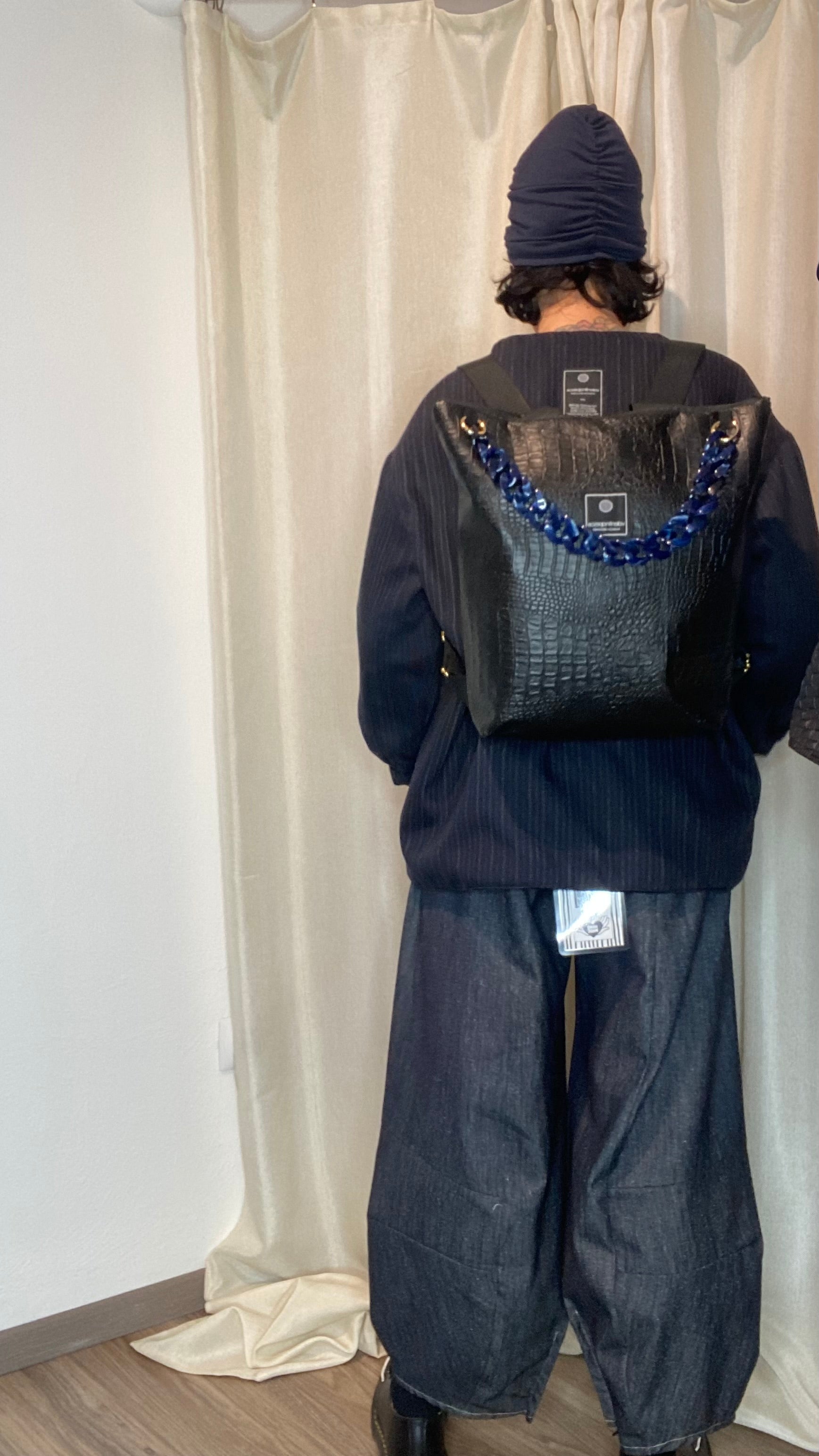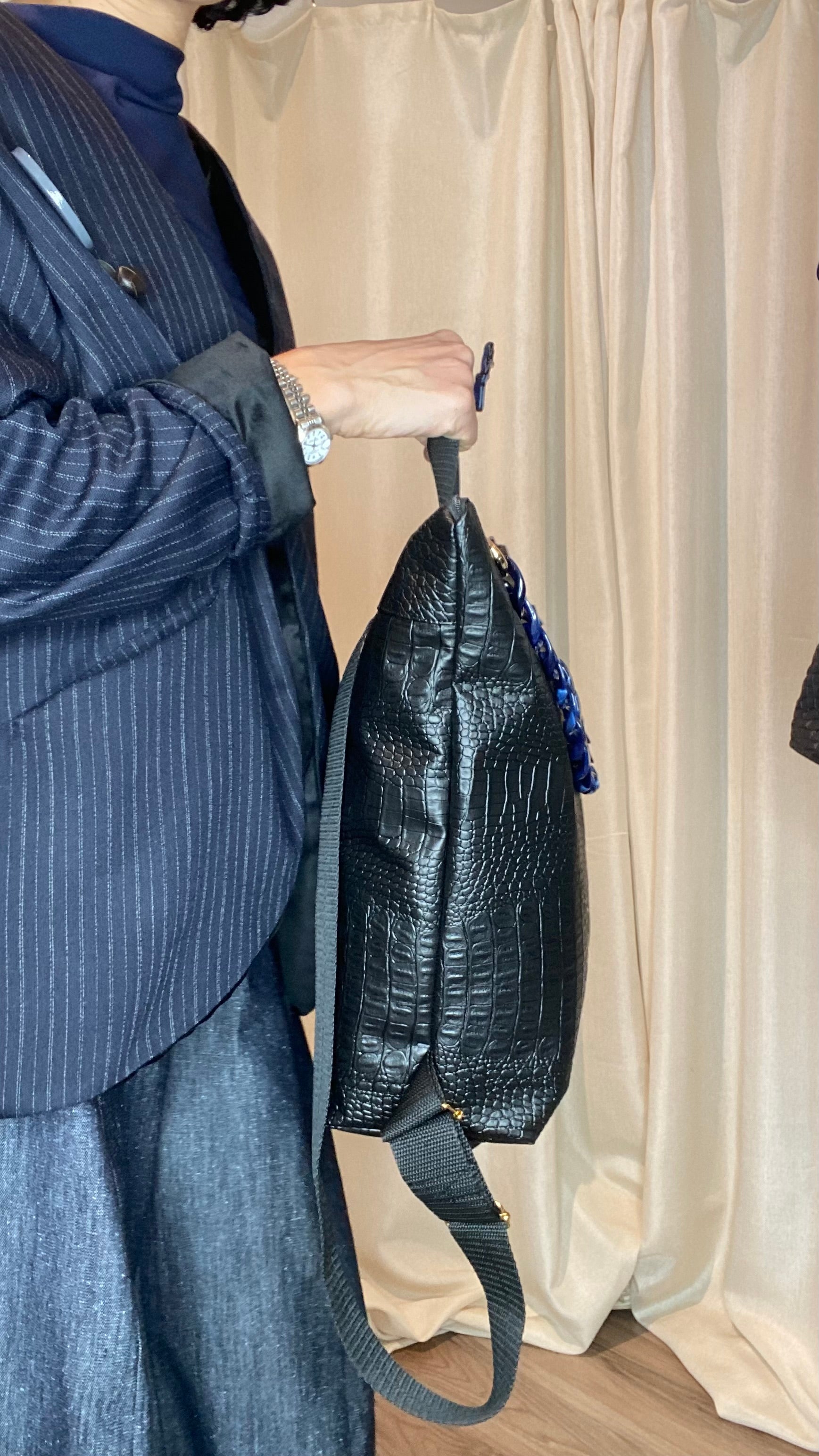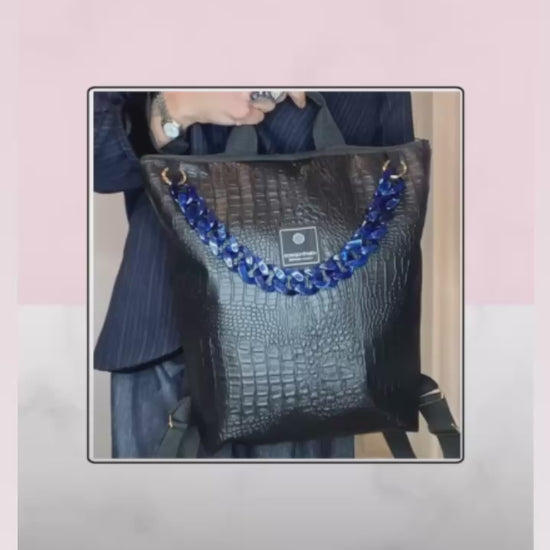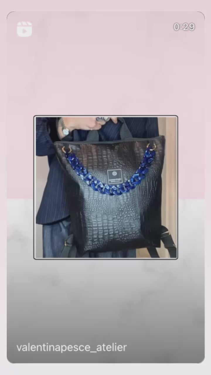 Zaino in pelle vegetale a trama nero con catena staccabile colorata, dotato di bretelle regolabili, cerniera esterna, tasca interna, foderato in cotone e con borsetta portamonete staccabile.