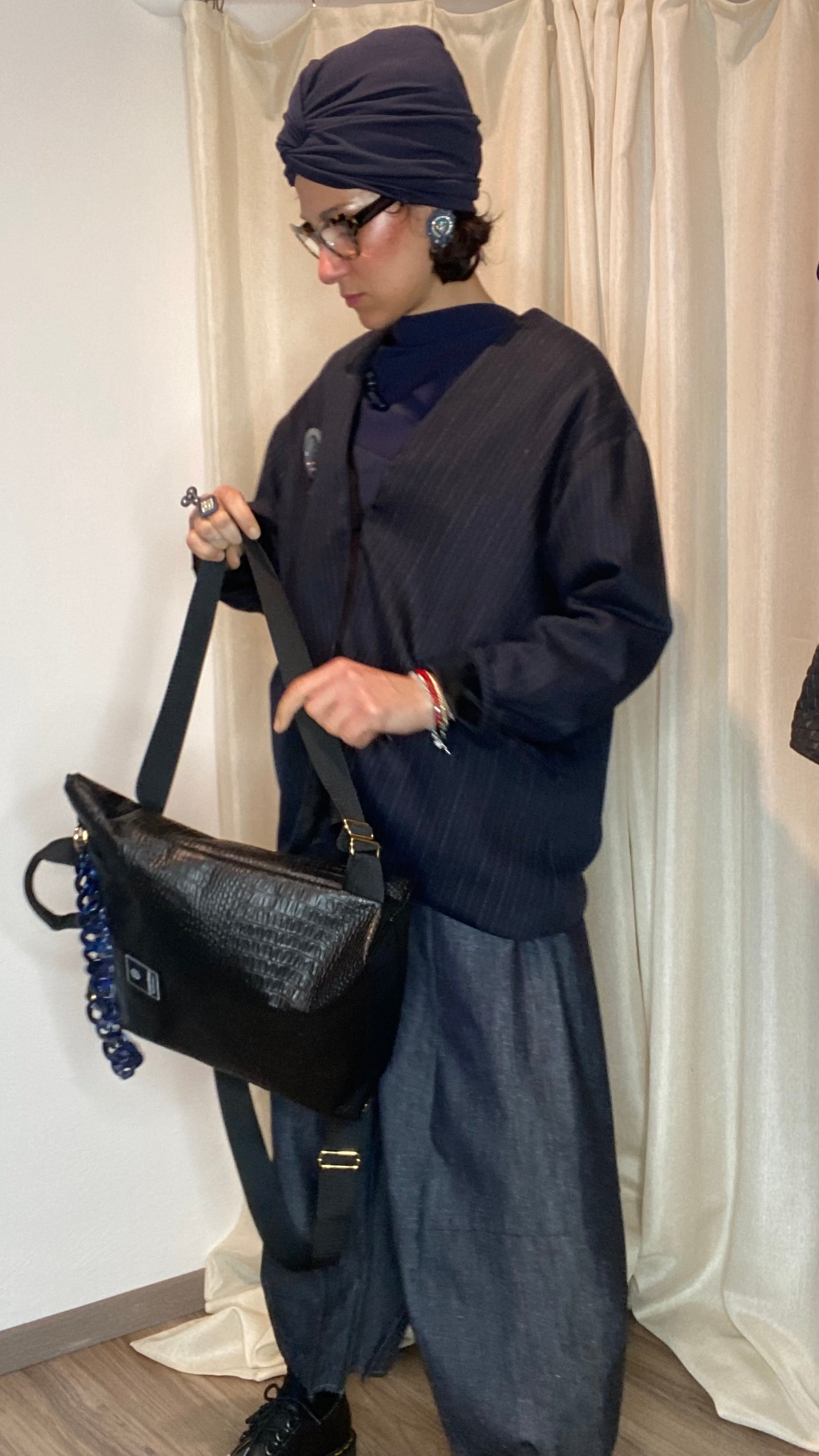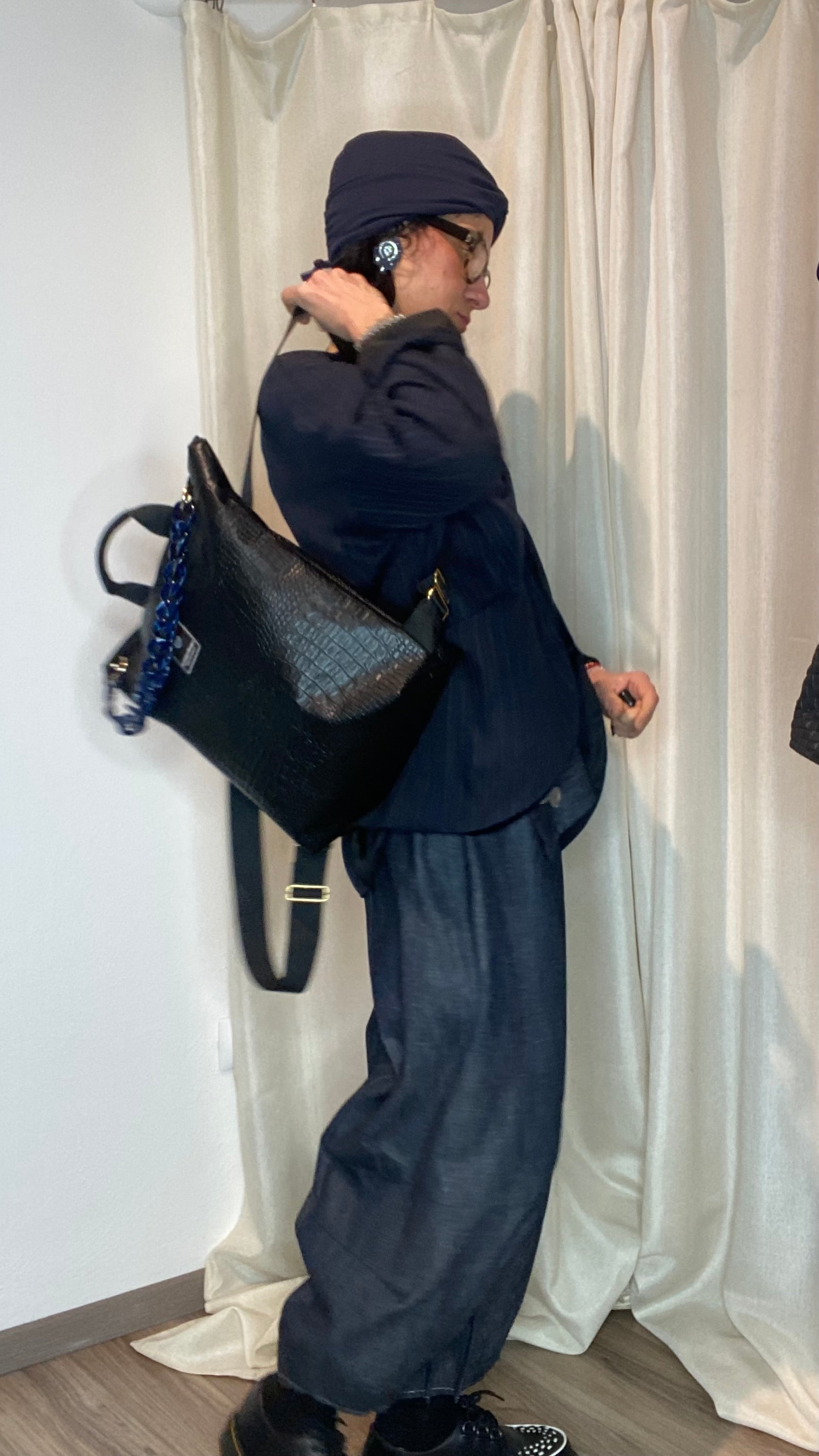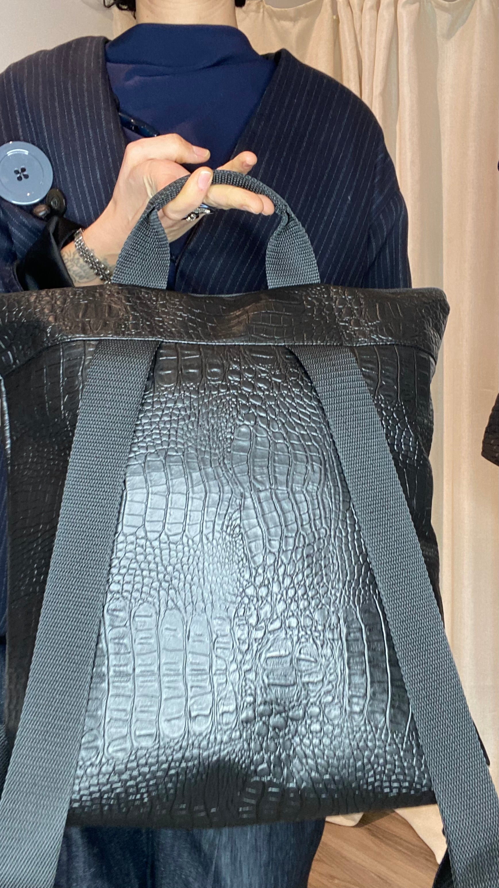 Zaino in pelle vegetale a trama nero con catena staccabile colorata, dotato di bretelle regolabili, cerniera esterna, tasca interna, foderato in cotone e con borsetta portamonete staccabile.